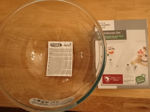先週のLidlの特売で、広告の品をゲットした。Pyrexのボウルと絞り器ケーキを作る時にハンドミキサーで使ってるボウルがプラスティックで、ガラスのが···