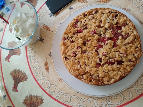 Eさんちでのおやつ今が旬のルバーブでケーキを作ってくれました。クリームを添えて!!テーブルには綺麗なお花が飾ってあった。Eさんちのお庭に咲いて···