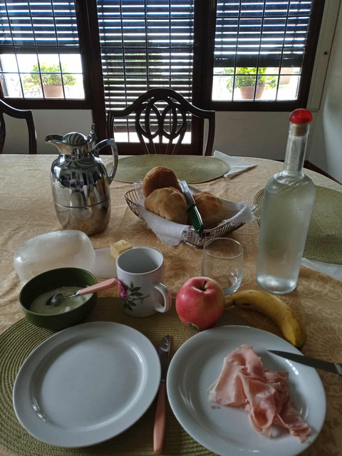 朝起きるとテーブルにはコーヒーとパンが用意されてる。冷蔵庫から好きな物をとって来て、フルーツも!!おばさんに申し訳ないことを伝えると、「あな···